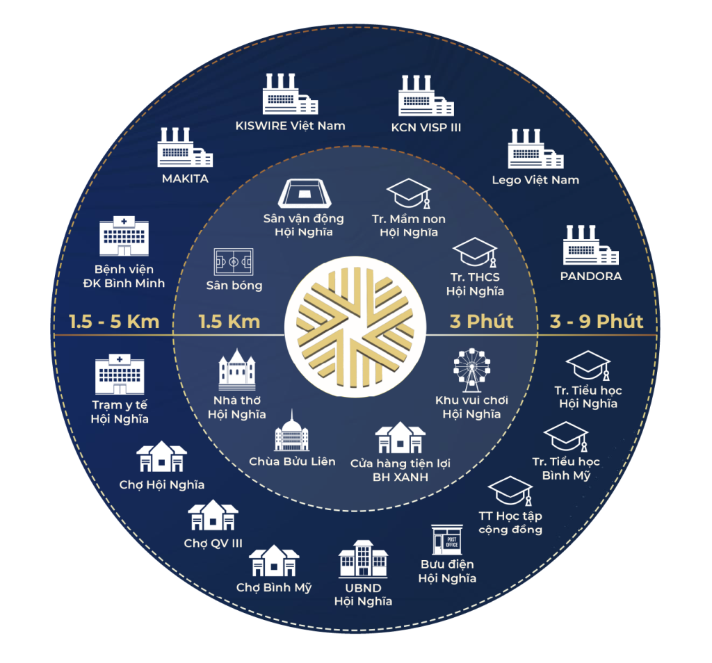 🔹Tọa lạc tại Hội Nghĩa – Tân Uyên, dự án sở hữu vị trí chiến lược với bán kính chỉ 1,5 – 5km đã kết nối hoàn chỉnh đến loạt tiện ích trọng yếu: từ chợ, UBND, trường học các cấp đến trung tâm y tế, sân vận động và nhà thờ. Đặc biệt, chỉ mất 3–9 phút để tiếp cận hàng loạt khu công nghiệp lớn như VISP III, KISWIRE, LEGO Việt Nam hay PANDORA – mở ra tiềm năng sinh lời cao cho nhà đầu tư và môi trường sống thuận tiện cho cư dân.
