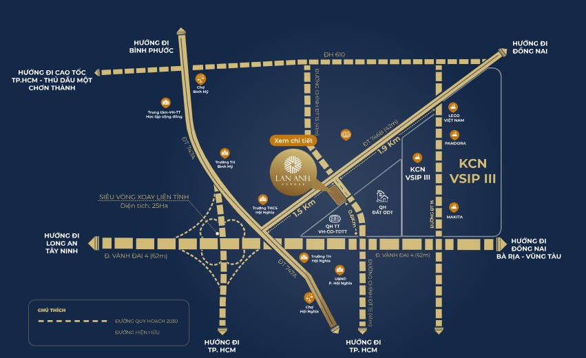 Dự Án Khu Nhà Ở Lan Anh tọa lạc tại phường Bình Cơ, TPHCM, ngay giao điểm vàng giữa hai đại lộ ĐT15 (41m) và ĐT746 (42m), liền kề KCN VSIP III và Vành đai 4. kết nối đa tiện ích.